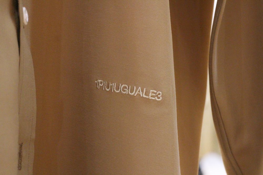 衿はやや小ぶりのレギュラーカラー、左前身裾部分に1PIU1UGUALE3大文字ロゴを小さめに刺繍しています。