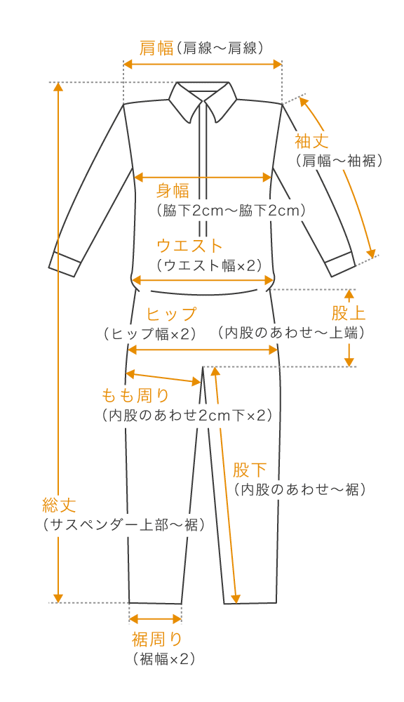 | サイズ | 肩幅 | 身幅 | 背丈 | 袖丈 | ワタリ | 股下 | 裾幅 |
